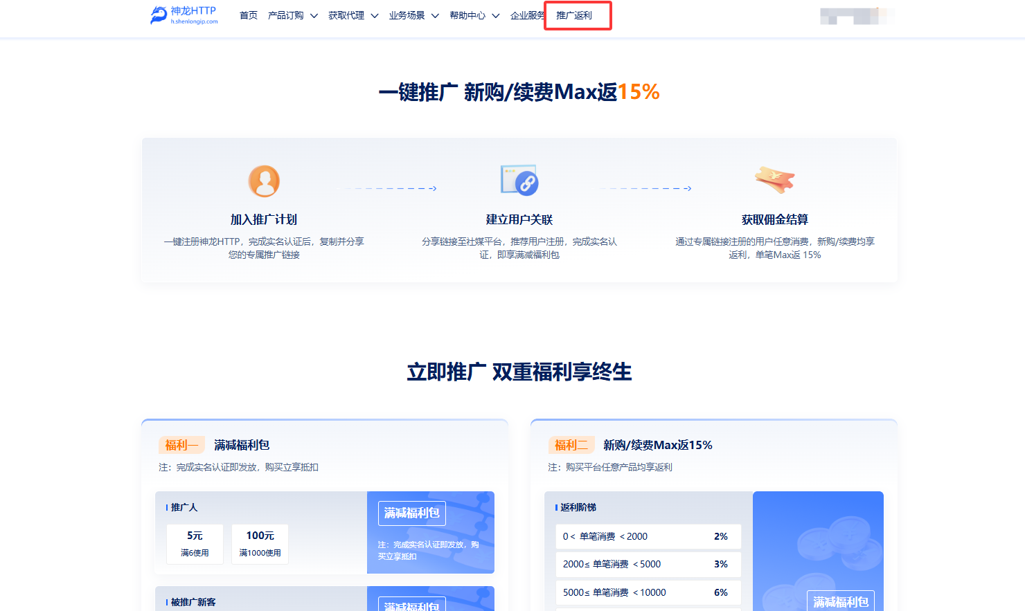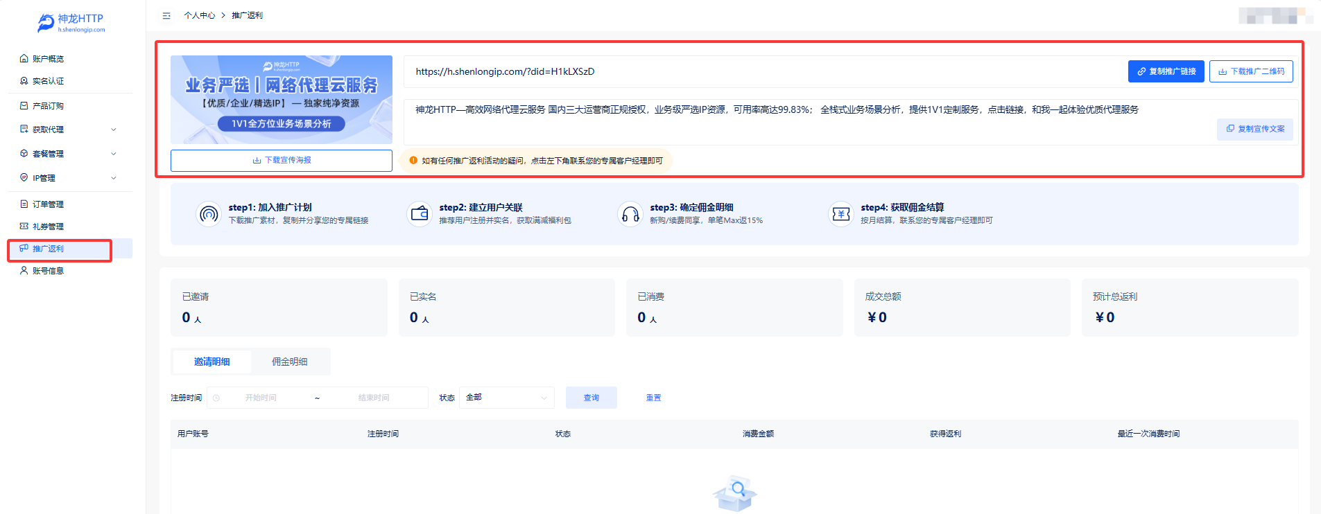 1、 注册一个神龙HTTP平台账号,通过【个人中心】—【推广返利】页面获取到专属分享链接,同时我们为您提供了宣传海报&文案,帮助您更有效地触达潜在用户。
