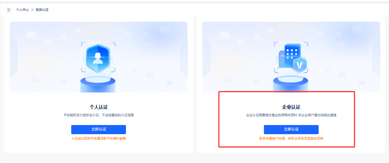 方式一:已通过个人认证的账户,可在个人中心页面点击“个人认证 查看”进行升级企业认证操作,上传营业执照照片即可