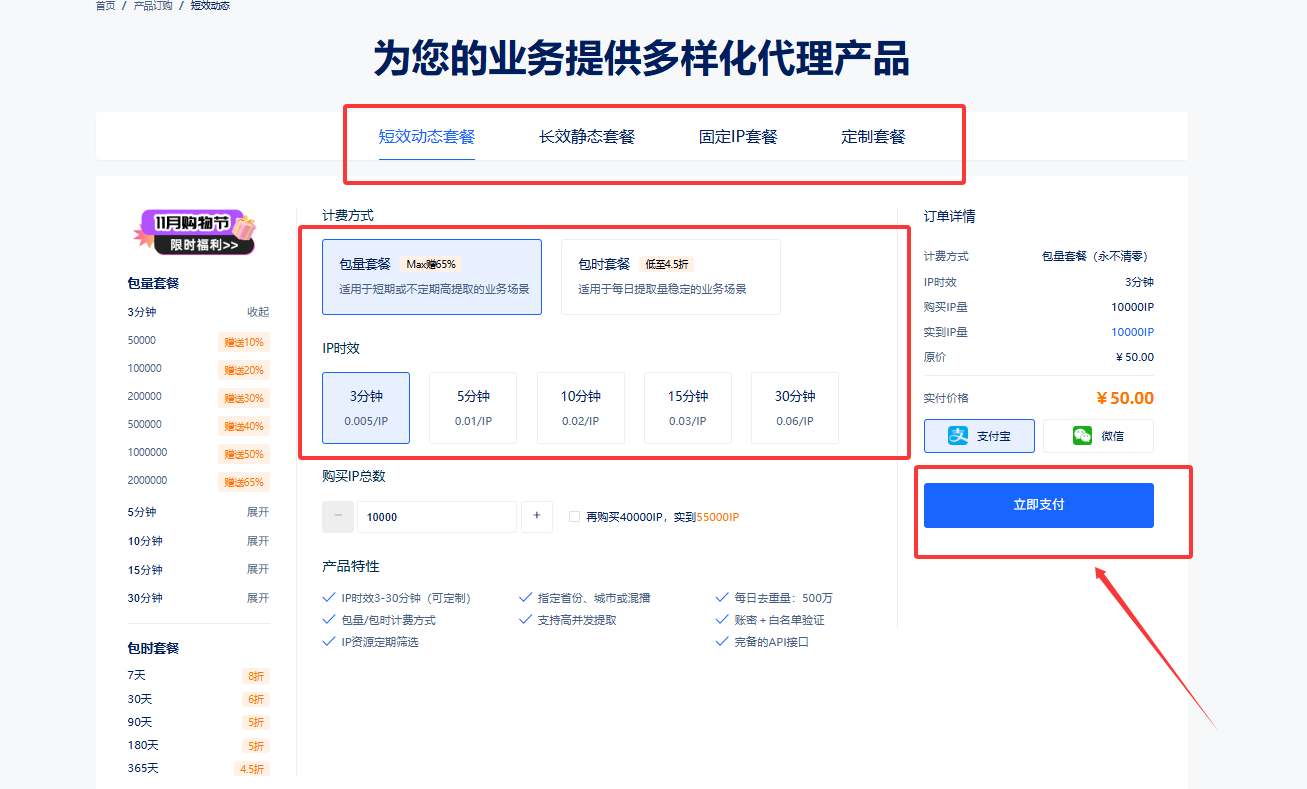 三、根据您的业务需求选择不同种类的IP,并根据【计费方式】【IP时效】【购买IP数量】等维度进行选购,最后选择支付宝或微信进行支付;