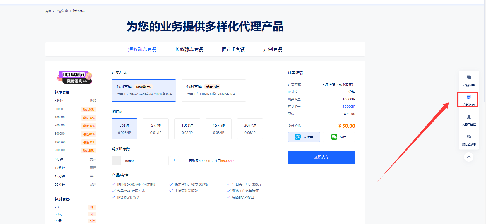 四、也可以点击右侧【在线咨询】,咨询在线客服,指导您进行套餐选购。