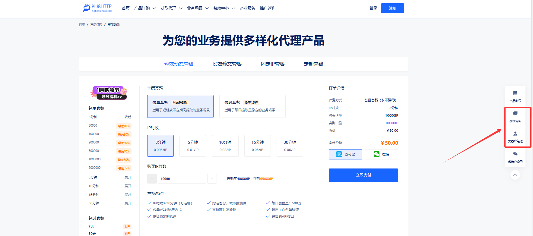 2、购买套餐:新用户注册登录成功后,点击进入【套餐购买】,进行选购套餐,也可以联系在线客服,点击右侧【在线咨询】(企业用户可咨询【大客户经理】),进行购买咨询并完成购买。
