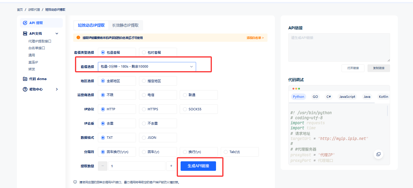 3、提取IP:点击【获取代理】-选择需要提取的IP类型,进入套餐提取页面。后续选择要提取的套餐类型,具体提取类型可根据拥有的套餐进行选择。然后根据自己的需要选择提取数量、支持的协议等,最后点击【生成API链接】即可提取IP。