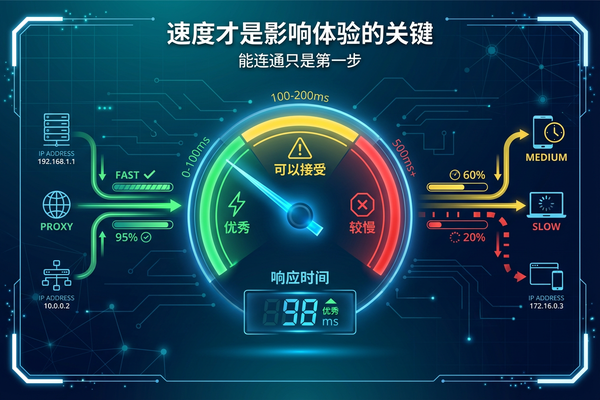 能连通只是第一步,速度才是影响体验的关键。速度慢的代理IP,即使用得通,也会让你等到没脾气。测试速度主要看响应时间,也就是从你发送请求到收到响应的时间。延迟在100毫秒以内算优秀,200毫秒以内可以接受,超过500毫秒就比较慢了。