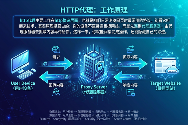 简单来说,http代理就像一个中间人,帮你转发网络请求。想象一下,你想给朋友送个礼物,但不想亲自露面,于是找了个跑腿小哥帮你送。这个跑腿小哥就是http代理——它接收你的请求,然后代替你去访问网站,最后把结果带回给你。整个过程,网站看到的是代理的地址,而不是你的真实地址,这就起到了一定的保护作用。